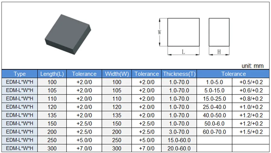 Chúng tôi cung cấp nhiều kích thước và loại tấm cacbua vonfram khác nhau, từ các kích thước tiêu chuẩn như 120x120x1.0mm đến 250x250x60mm. Ngoài ra, chúng tôi cũng nhận gia công các sản phẩm theo bản vẽ hoặc mẫu mà bạn yêu cầu, đảm bảo tính linh hoạt và đáp ứng mọi nhu cầu đặc thù của bạn.